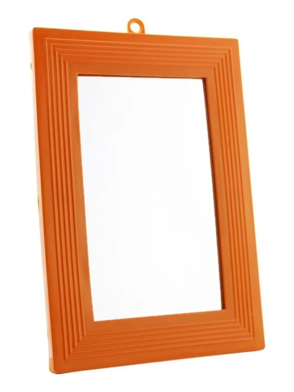 Espelho com moldura plástica na cor laranja, ideal para o uso diário, adaptável a qualquer ambiente da casa. Muito utilizado em banheiros para atividades como barbear ou maquiar, devido à sua leveza e simplicidade. Prático, funcional e versátil.