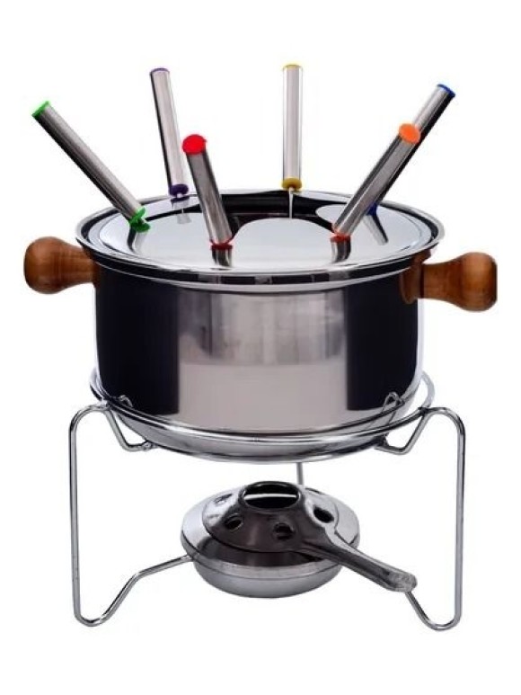 - Aparelho de Fondue Berna com 10 peças – panela inox com alças em madeira, suporte, queimador e 6 garfos coloridos. Ideal para queijos, chocolates