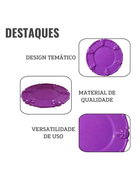 Produzida em plástico leve e durável, a bandeja é fácil de manusear e limpar, garantindo praticidade durante e após o evento. Seu design temático pode incluir cores e estampas características do Halloween, como abóboras, caveiras, teias de aranha e outros símbolos clássicos que remetem à data.