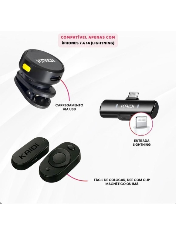 - Microfone de Lapela Sem Fio Duplo Kaidi KMF4-A Lightning para iPhone e iPad com Cancelamento de Ruído e Alta Qualidade de Áudio