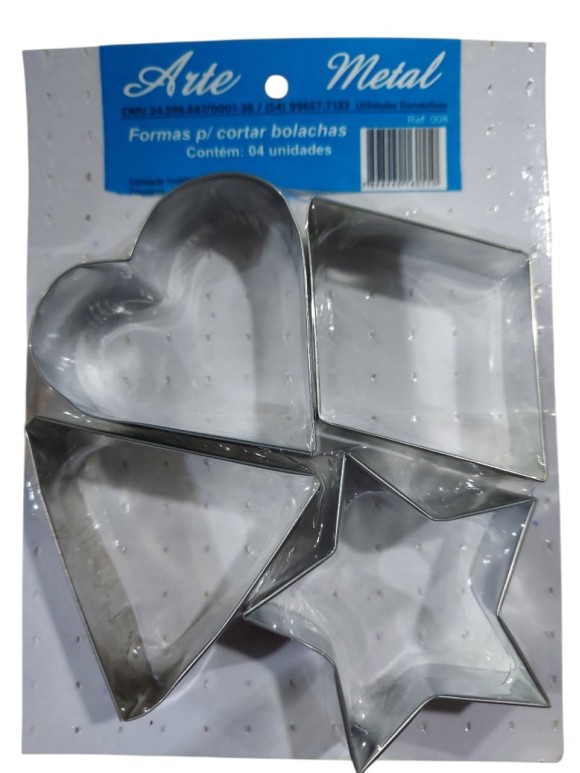 O conjunto contém 4 moldes metálicos com tamanhos variados, ideais para criar diferentes tipos de bolachas ou biscoitos. O kit pode conter formatos clássicos (como redondo, coração, estrela ou flor), permitindo composições criativas e divertidas em cada fornada.
