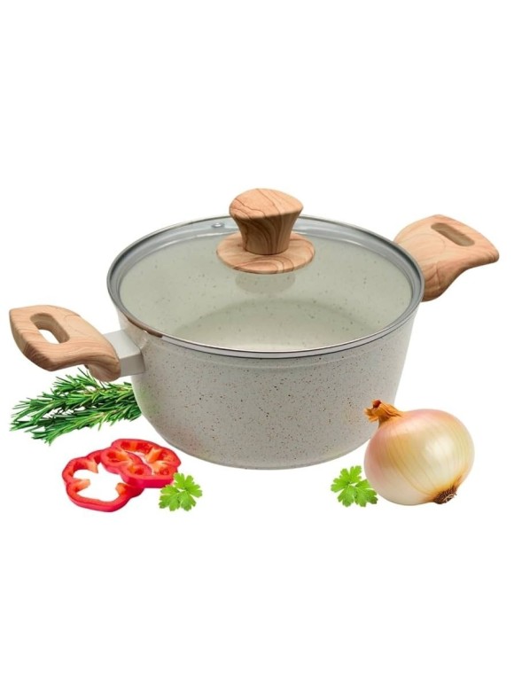 Caçarola Indução Antiaderente 24cm Bege com Tampa de Vidro | Fundo Triplo Magnético, Cabo Soft Touch e Revestimento Saudável